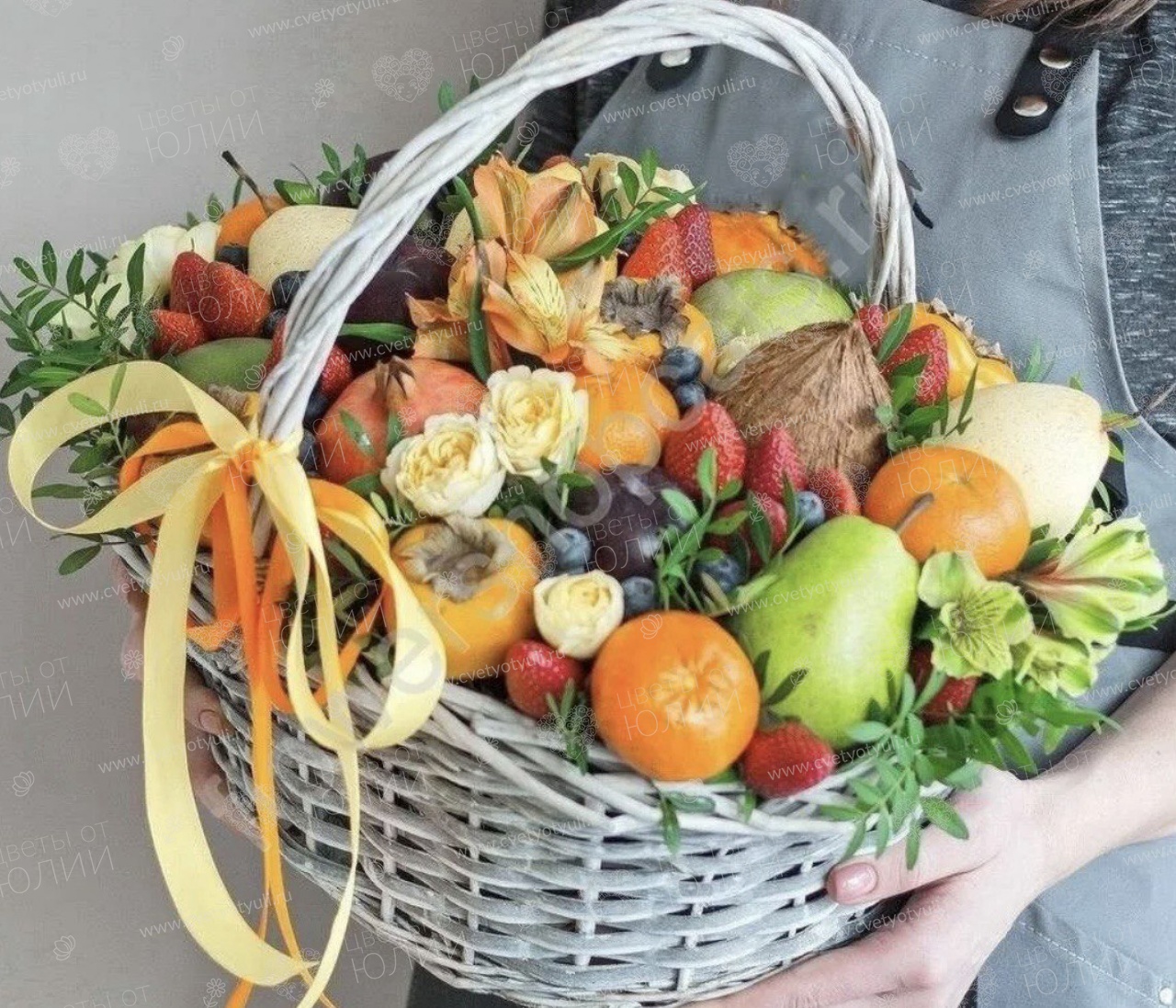 Корзина с фруктами будет отличным дополнением к шикарному букету цветов.