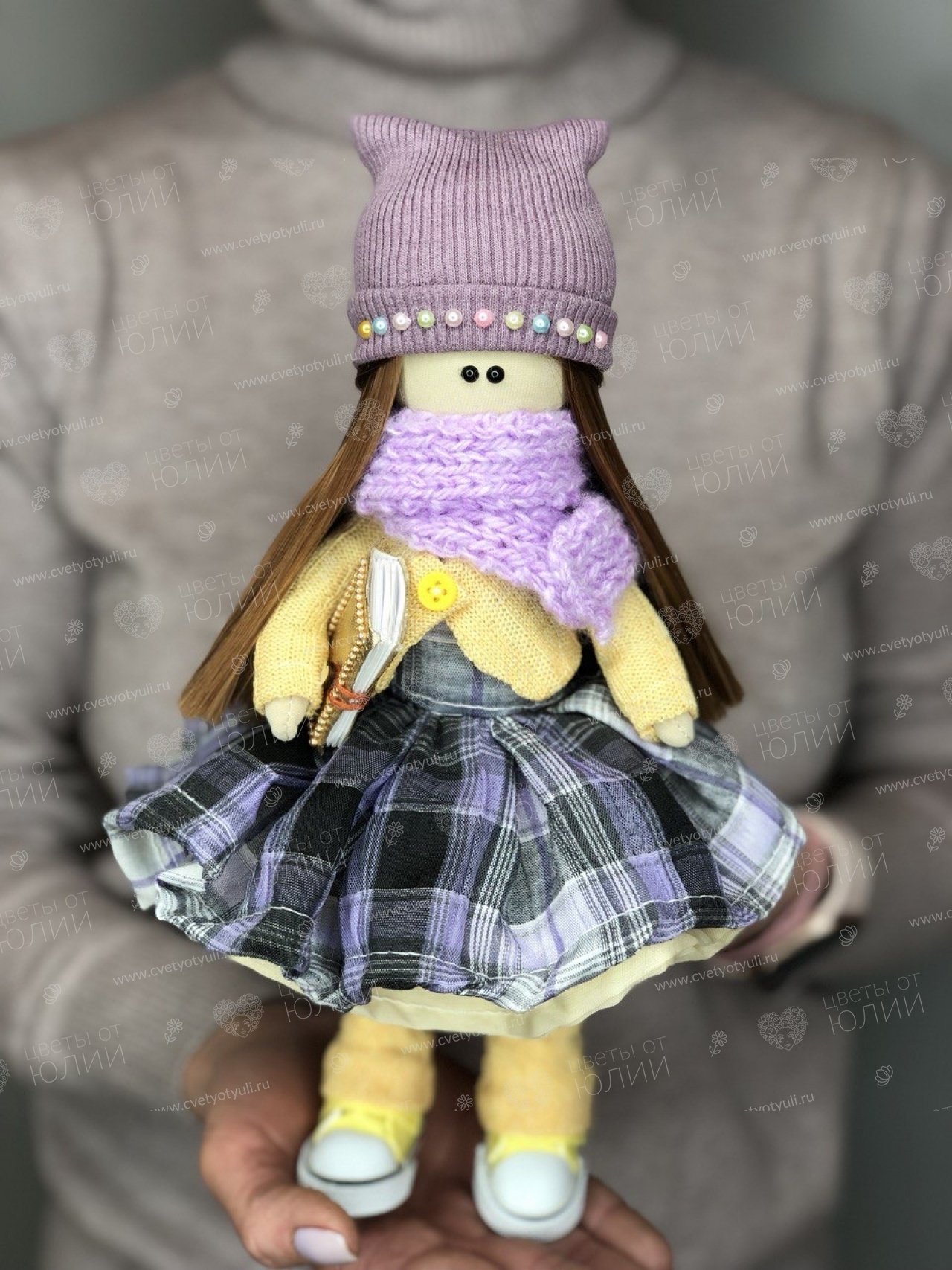 Кукла-тильда ручной работы "Девочка с книгой" в фиолетовой шапке и фиолетовом шарфе.