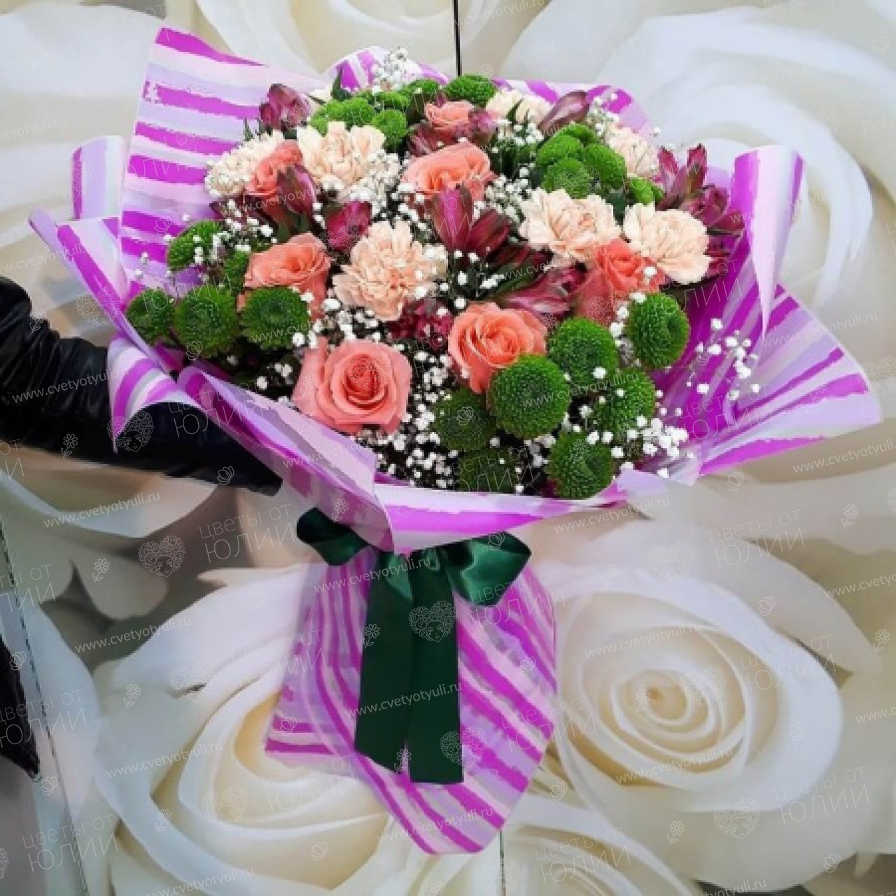 • Состав: Альстромерии, Хризантемы, Розы, Гвоздики