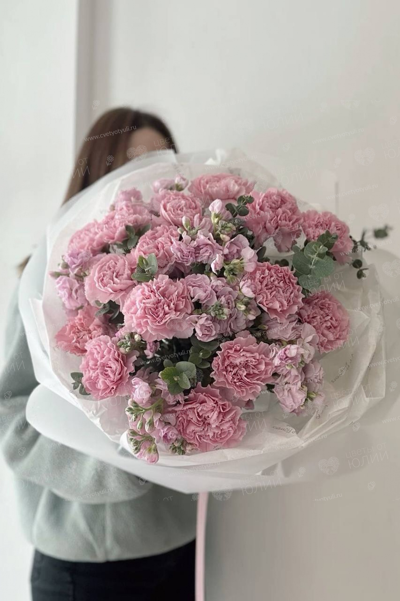 Диантус - 15 шт, Лента, Матиола - 8 шт, Упаковка, Эвкалипт