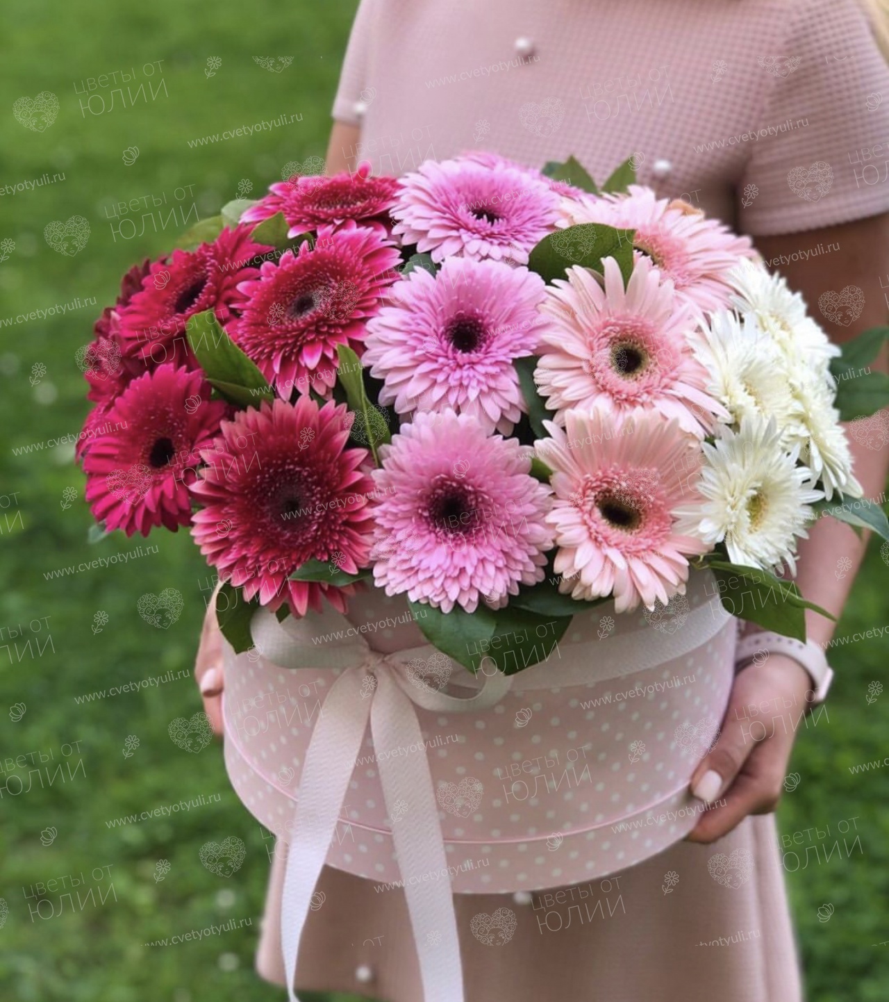 Гербера - 25 шт, салал, шляпная коробка, лента.