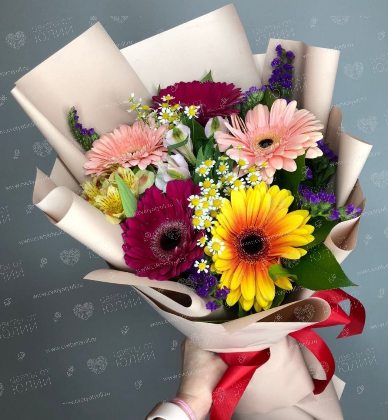 • Состав: Герберы, Альстромерии, Хризантемы, Упаковка, Зелень