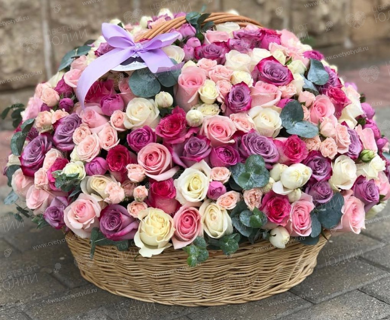 Роза 50 см - 201 шт, роза кустовая - 50 шт, эвкалип, корзина.