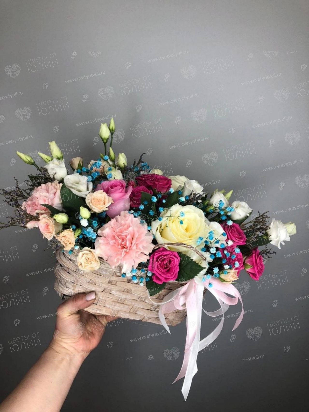 Роза - 3 шт, роза спрей - 4 шт, эустома - 2 шт, гвоздика - 3 шт, , оксипеталум - 1 шт, лимониум - 1 шт, корзинка, лента.