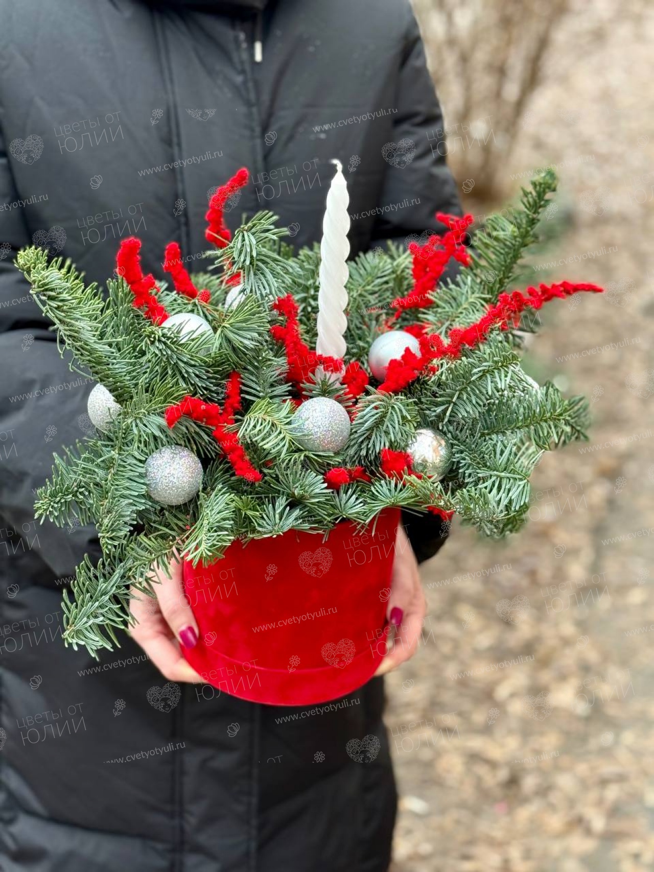 Стильная новогодняя композиция "Алая звезда" с контрастным сочетанием серебристой пихты и ярких красных акцентов создаёт эффектный праздничный образ. Белая витая свеча добавляет композиции элегантности и создаёт уютную атмосферу. Компактный размер и насыщенная цветовая гамма делают эту композицию идеальным выбором для украшения стола или подоконника.