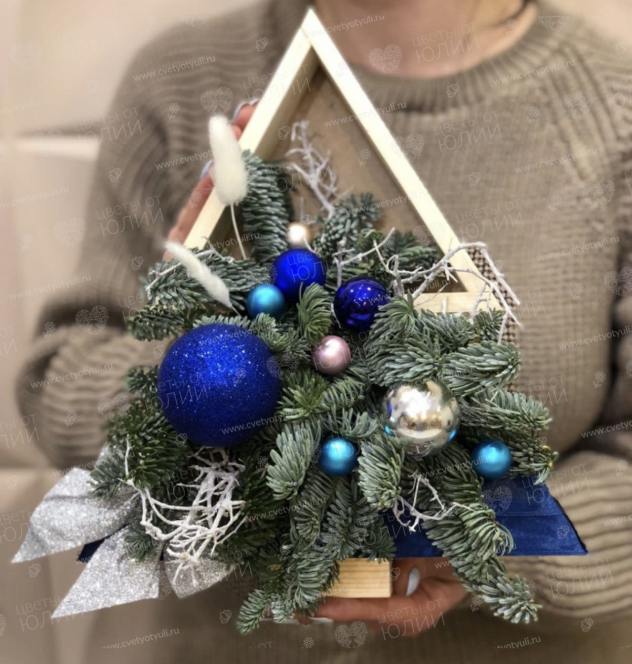 Елка, шишки, игрушки, сухоцветы, деревянный ящик "Елочка"