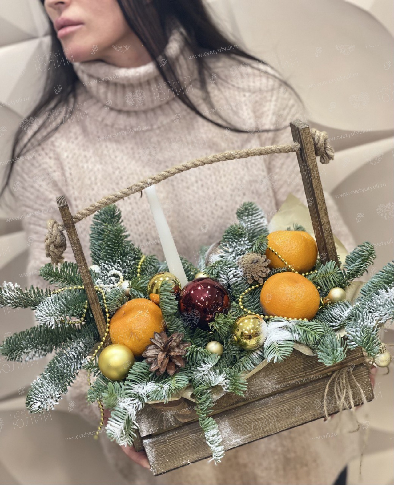 Ёлка, мандарины, шишки, игрушки, деревянный ящик, свеча, упаковка