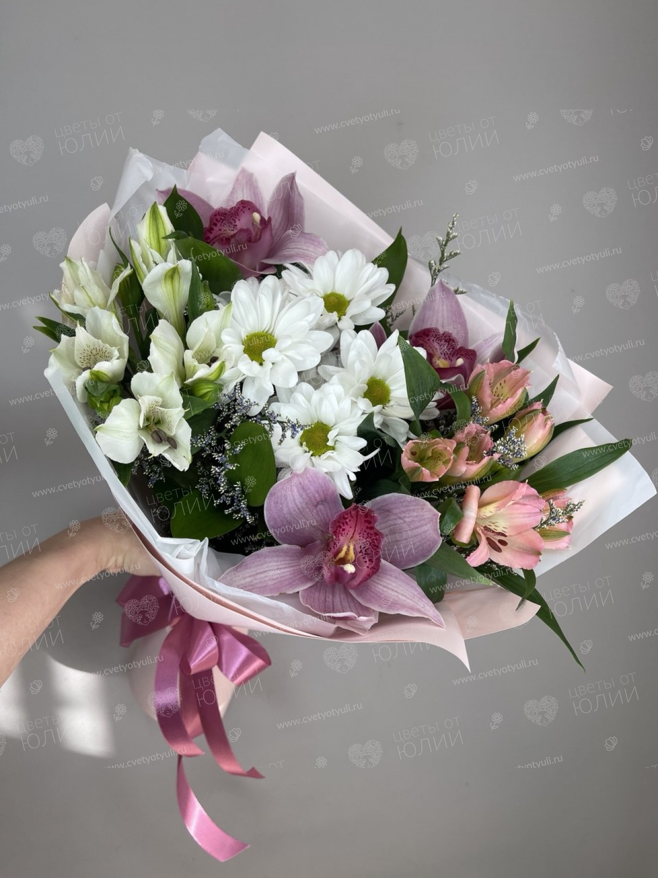 • Состав: Хризантема кустовая, Астольмерия, Орхидея цимбибиум, Лимониум, Руску4с, Упаковка, Атласная лент
