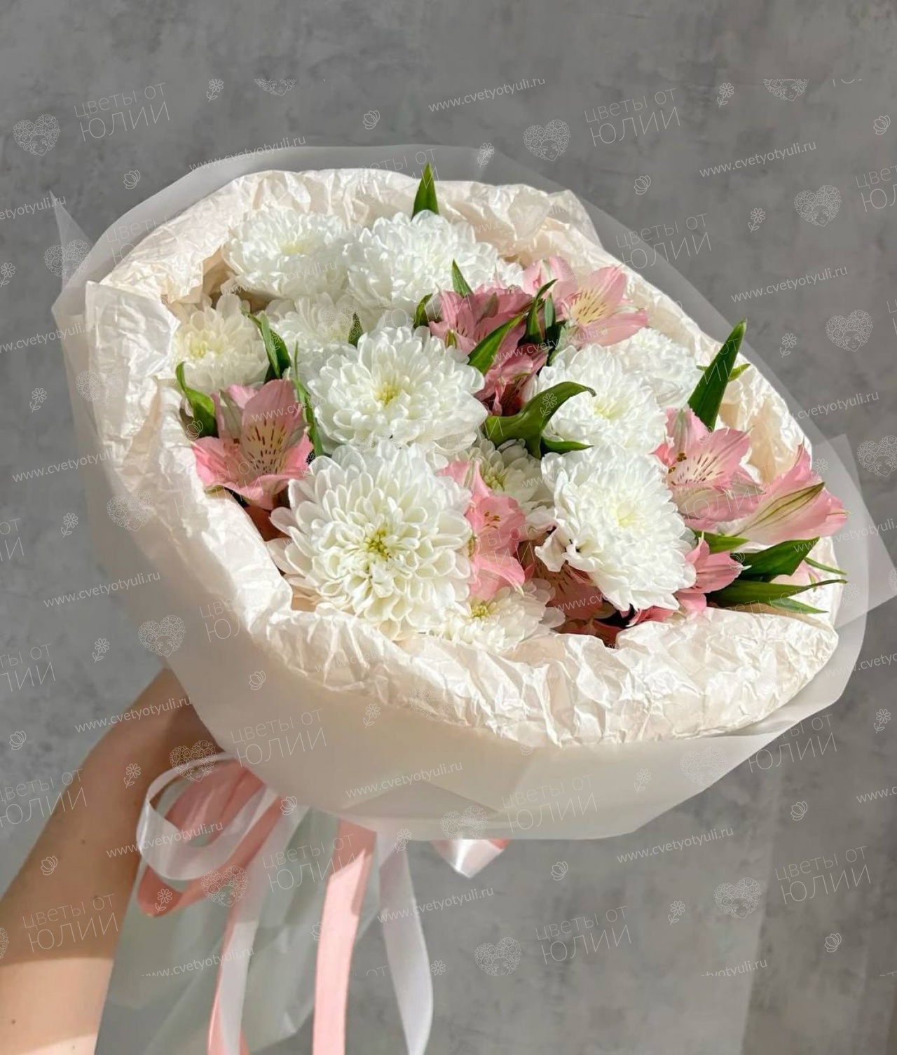 Альстромерия - 4 шт, Атласная лента, Упаковка, Хризантема кустовая - 3 шт
