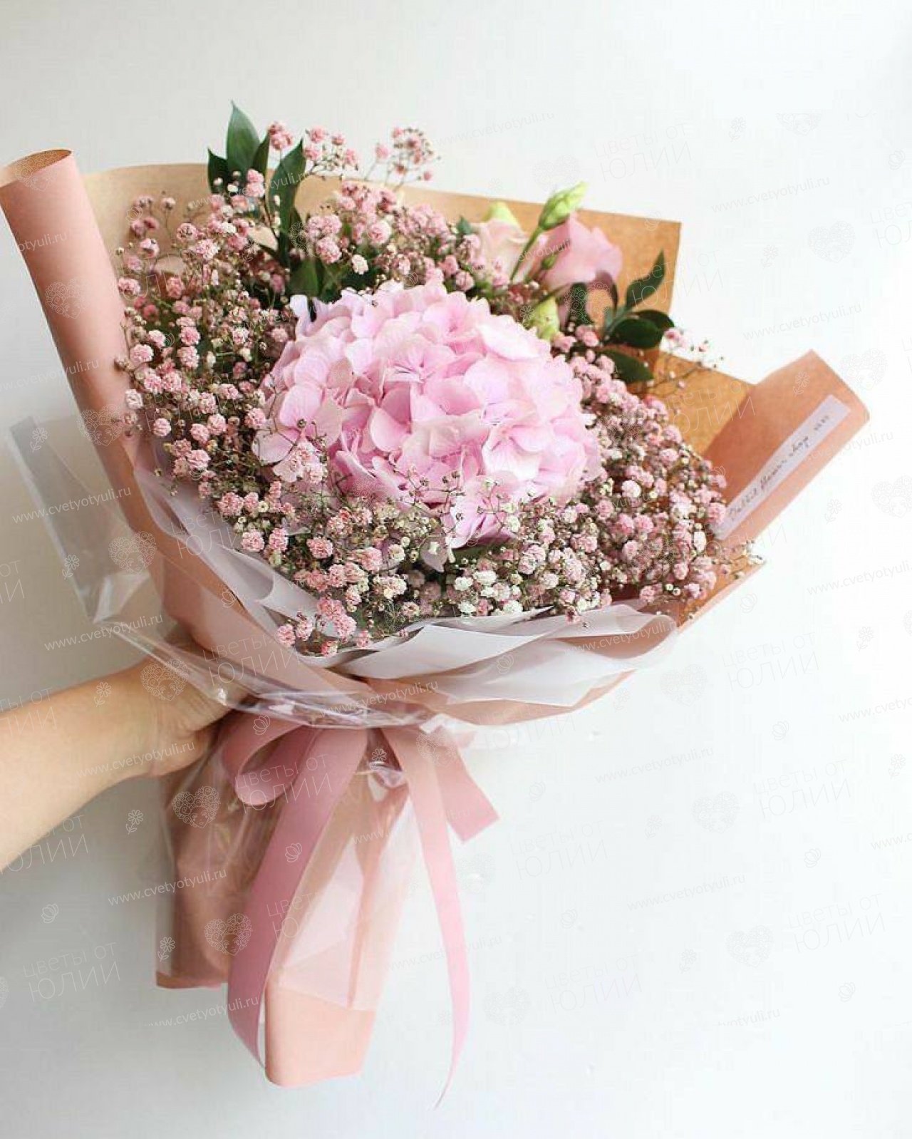 Атласная лента, Гипсофила - 5 шт, Гортензия - 1 шт, Рускус - 2 шт, Упаковка, Эустома - 1 шт