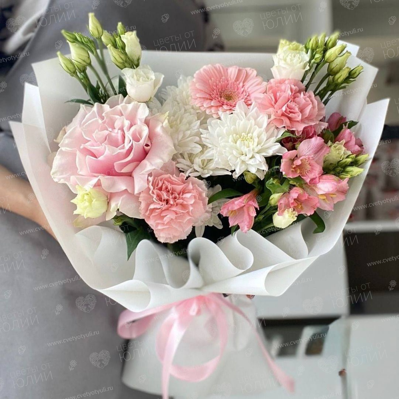 Альстромерия, Атласная лента, Гербера, Диантус - 2 шт, Роза французская , Упаковка, Хризантема кустовая, Эустома - 3 шт