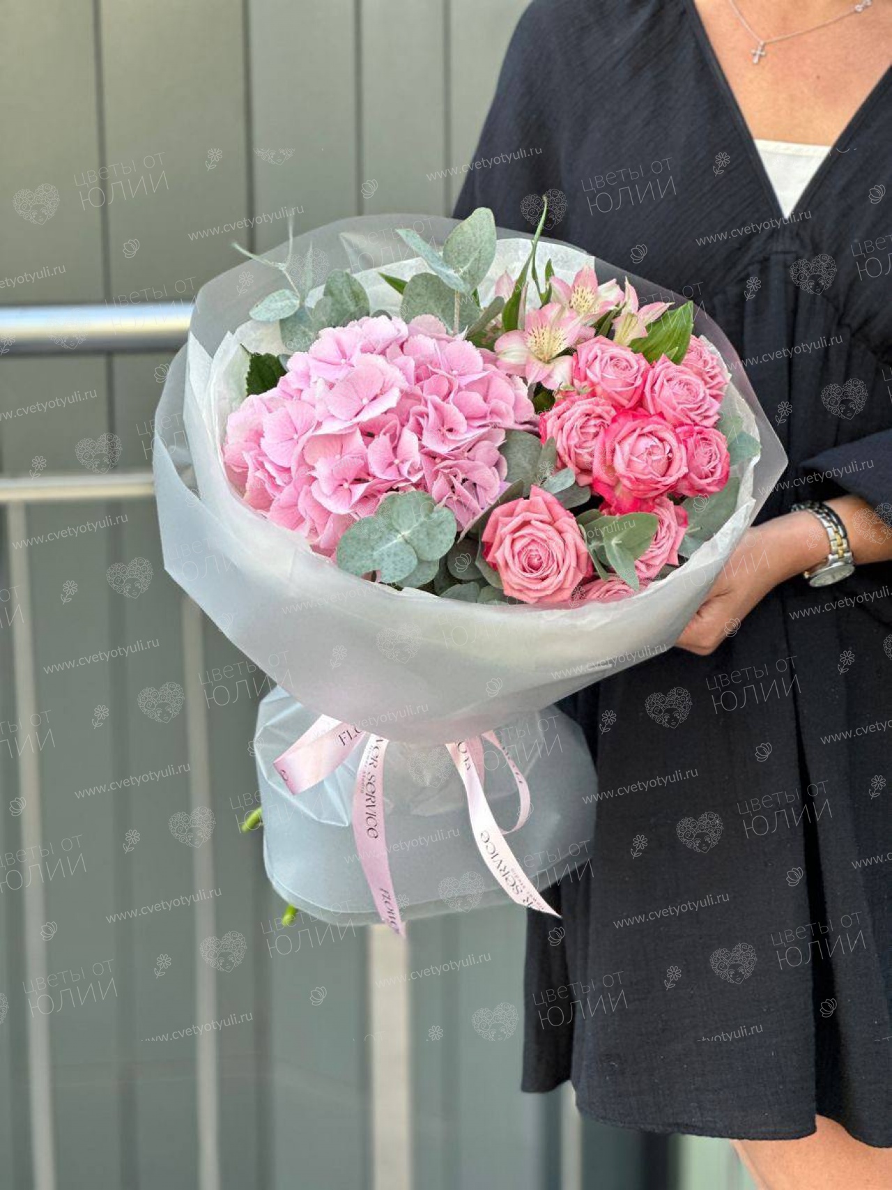 Альстромерия, Атласная лента, Гортензия, Роза кустовая пионовидная 70 см - 2 шт, Упаковка, Эвкалипт
