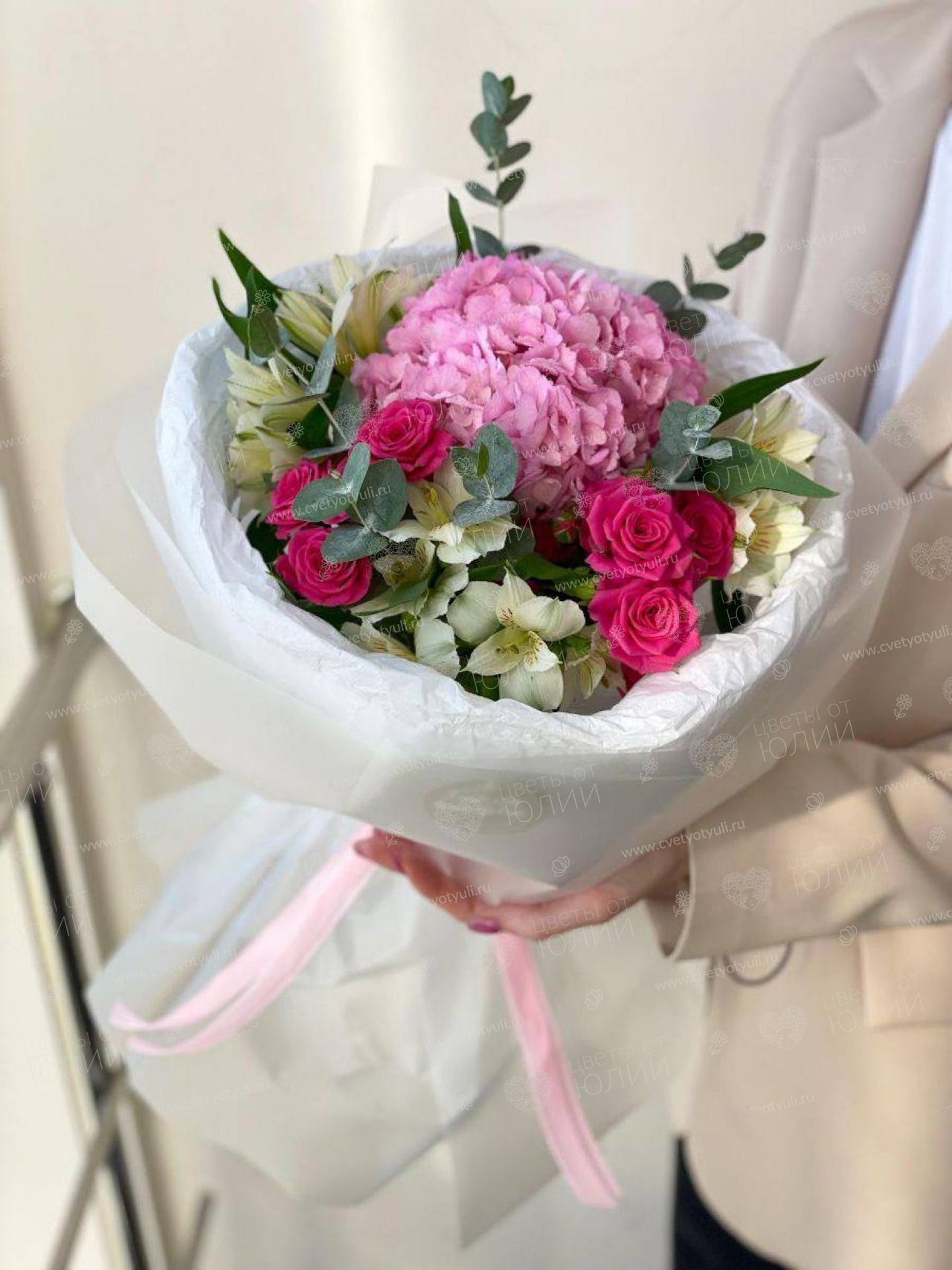 Альстромерия - 3 шт, Атласная лента, Гортензия, Роза кустовая пионовидная 70 см - 2 шт, Упаковка, Эвкалипт