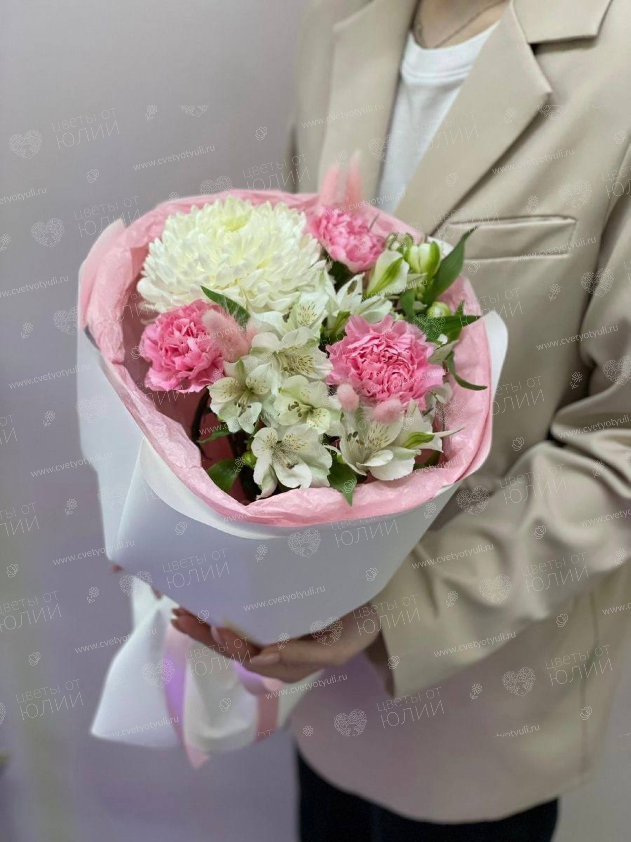 Альстромерия - 4 шт, Атласная лента, Диантус - 3 шт, Ларгус - 2 шт, Упаковка, Хризантема одноголовая