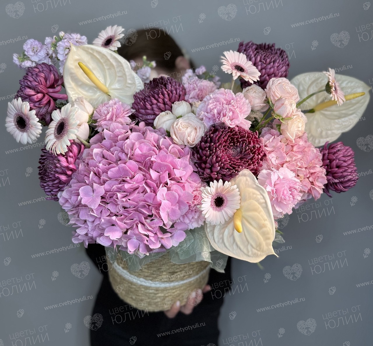 Альстромерия - 3 шт, Антриум срезка - 3 шт, Атласная лента, Биофлора - 1 шт, Гербера - 9 шт, Гортензия - 3 шт, Диантус - 5 шт, Корзина мягкая - 1 шт, Матиола - 4 шт, Роза кустовая пионовидная 70 см - 5 шт, Упаковка, Хризантема одноголовая - 6 шт