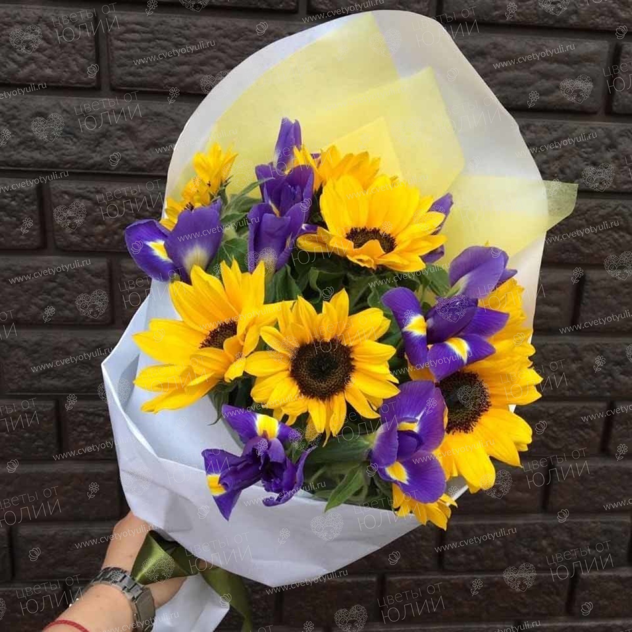 Гелиантус - 7 шт, ирис - 8 шт, упаковка, лента.