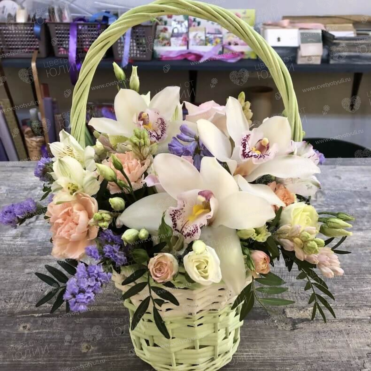 Орхидея - 3 шт, эустома - 2 шт, роза - 1 шт, статица - 1 шт, альстромерия - 2 шт, гвоздика кустовая - 1 шт, писташ - 2 шт, корзинка.