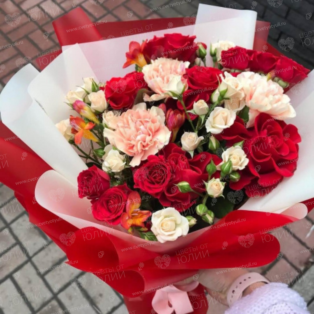 Роза 50 см - 5 шт, роза кустовая - 5 шт, гвоздика - 3 шт, фрезия - 4 шт, упаковка, лента.