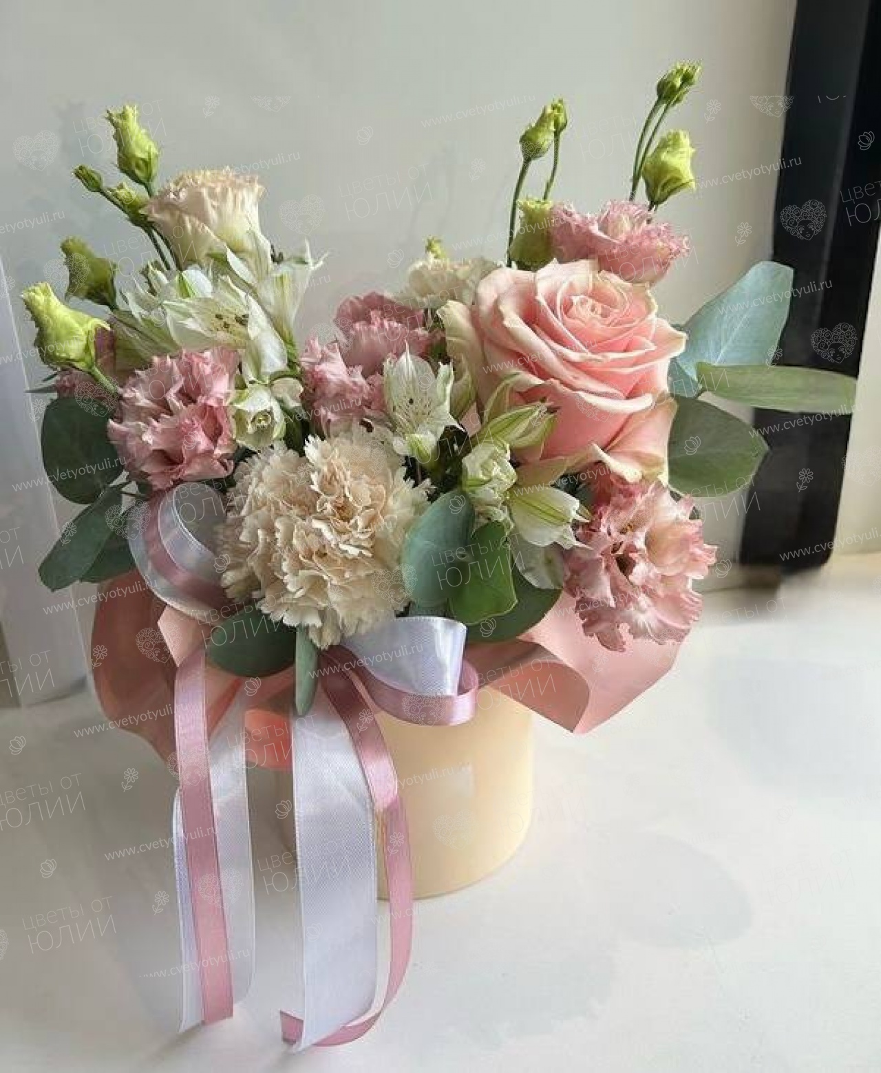Альстромерия - 2 шт, Биофлора, Диантус, Лента, Роза эквадор 60 см, Упаковка, ШК Средняя, Эвкалипт, Эустома