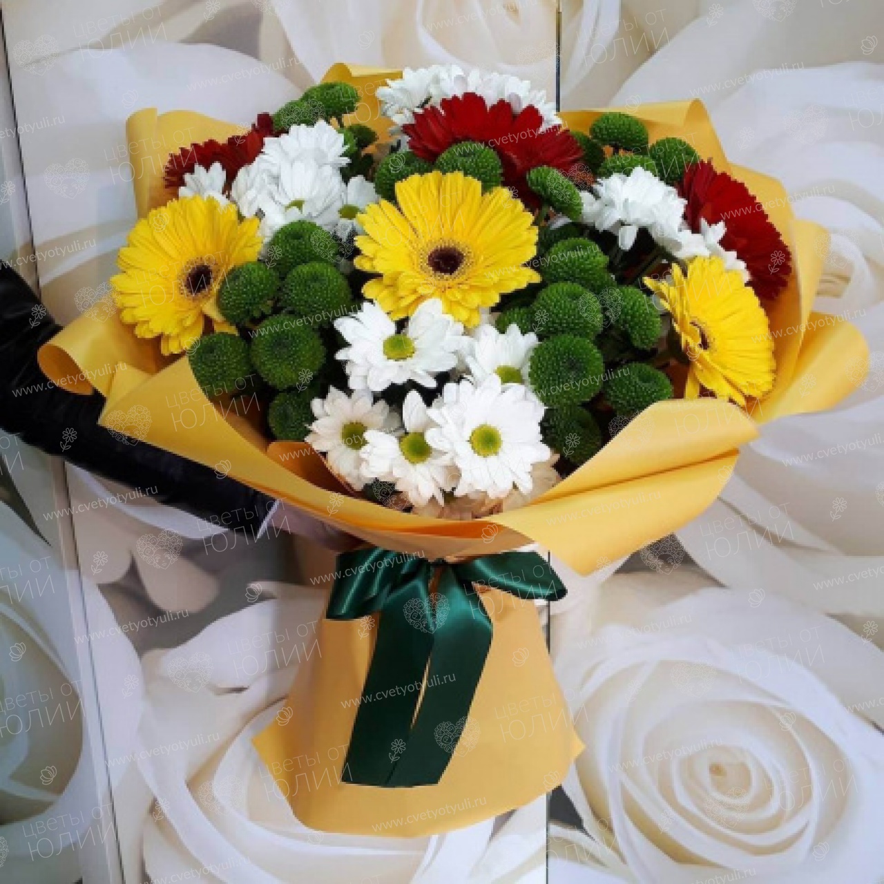 Гербера - 6 шт, Хризантема кустовая - 9 шт, упаковка, лента.