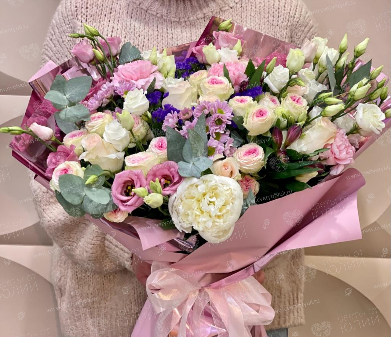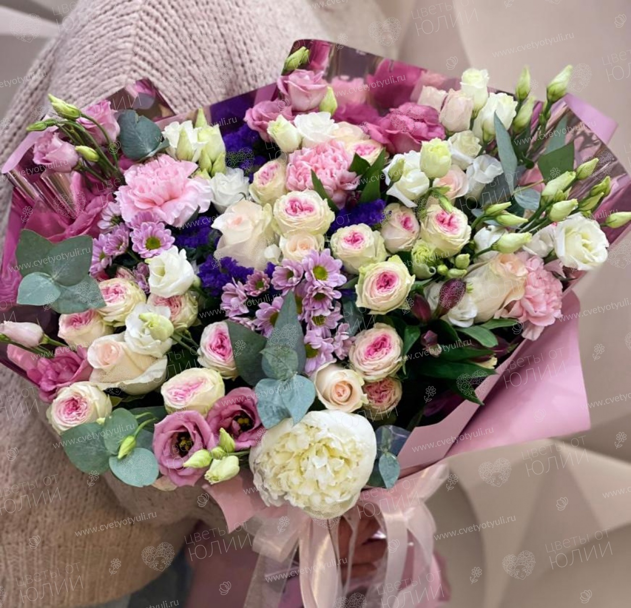 Роза кустовая пионовидная - 3 шт, роза 40 см - 7 шт, Хризантема кустовая - 2 шт, георгин - 1 шт, статица - 1 шт, дельфиниум - 5 шт, альстромерия - 2 шт, гвоздика - 3 шт, эустома - 3 шт, эвкалипт, упаковка, лента.