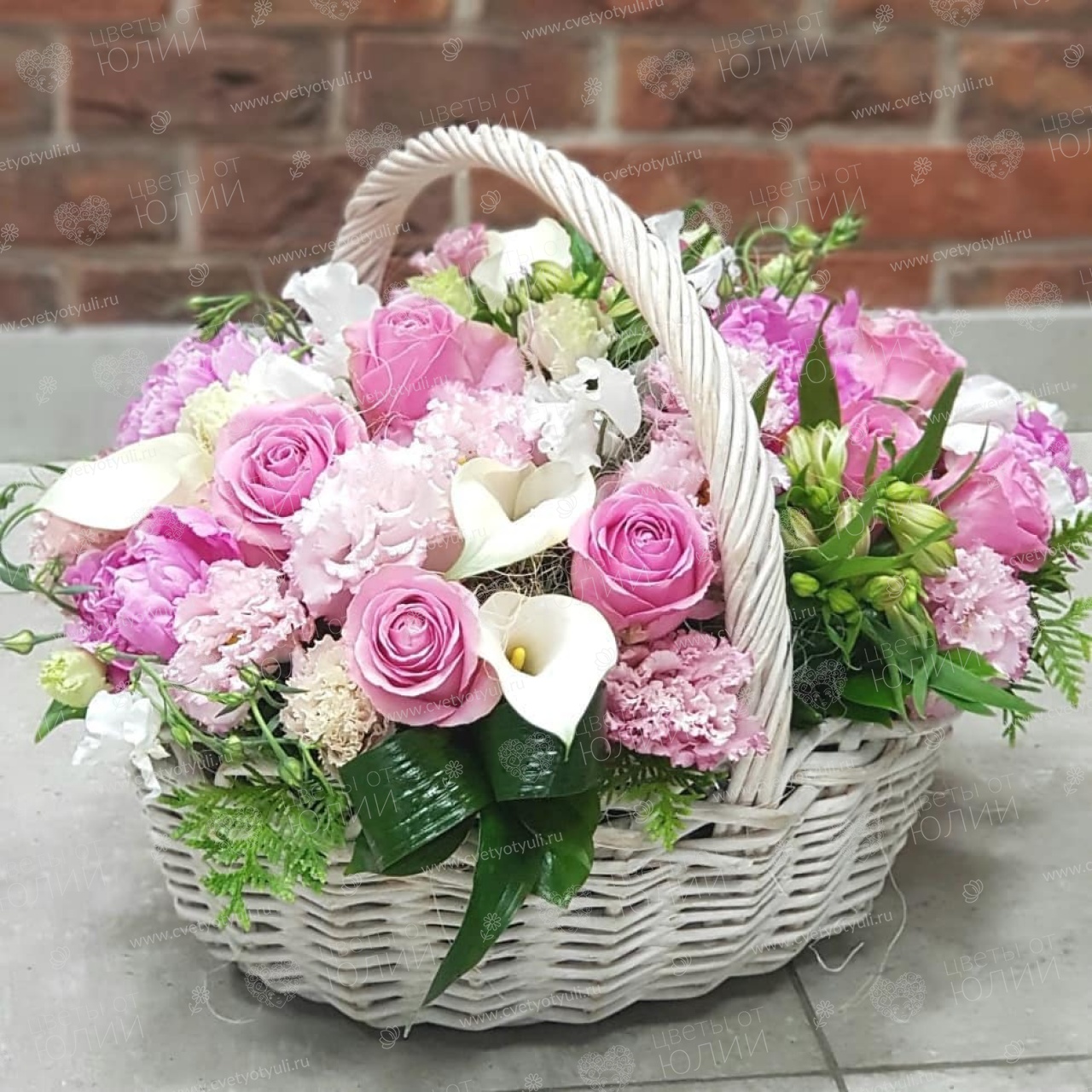Роза 40 см - 11 шт, пион - 3 шт, калла - 4 шт, эустома - 5 шт, альстромерия - 6 шт, лист аспедистры - 2 шт, зелень, корзина.