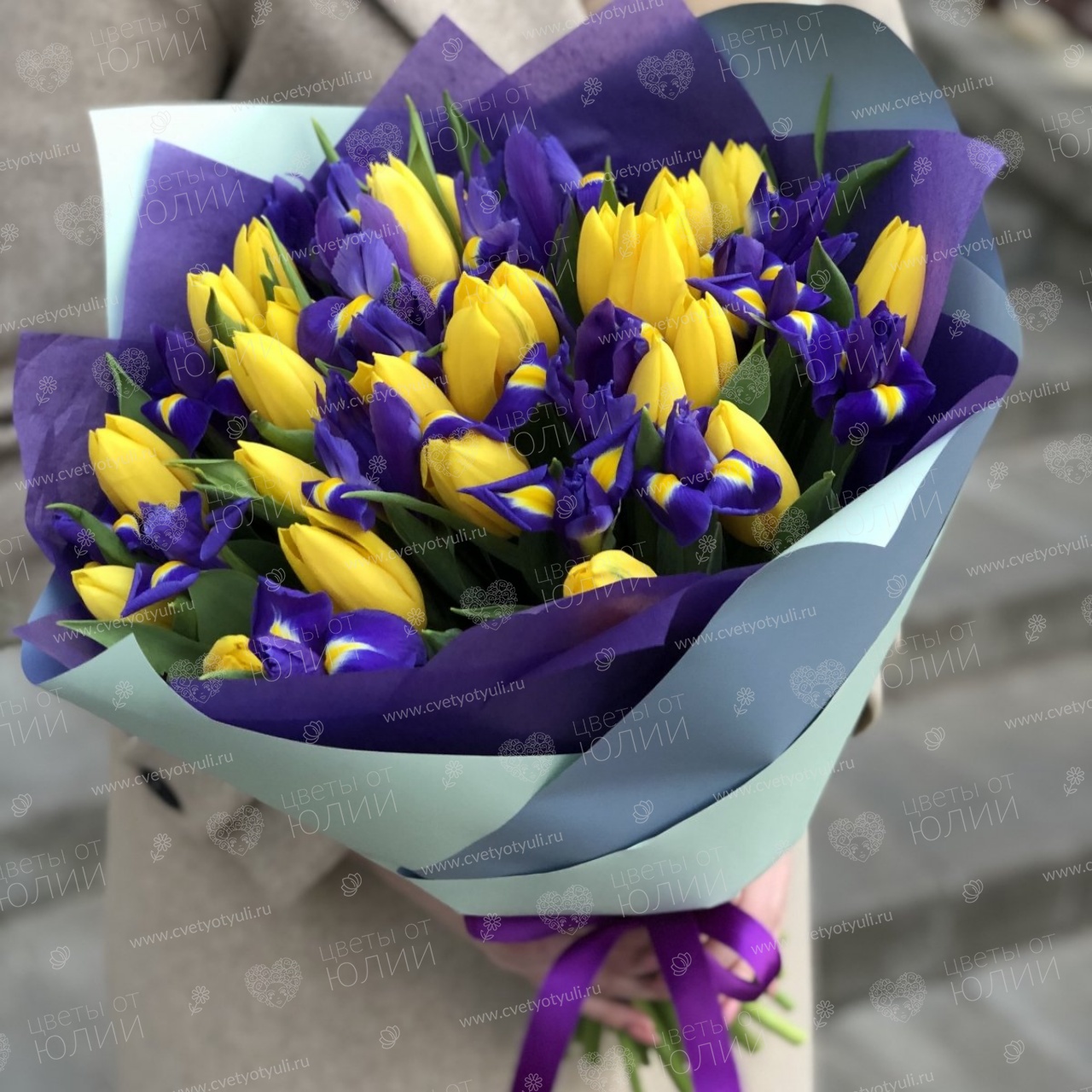 Тюльпан - 15 шт, ирис - 14 шт, упаковка, лента.